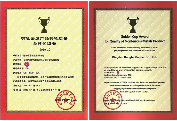 201910月至12月,中國有色金屬工業協會專家委員會對青島宏泰銅業有限公司申報的空調與制冷設備用銅及銅合金無縫管進行實地審核和答疑。經專家委員會審核認定:青島宏泰銅業有限公司申報的空調與制冷設備用銅及銅合金無縫管的實物質量達到了國際同類產品實物質量,特授予有色金屬產品實物質量金杯獎。
