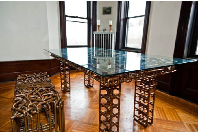以上圖片所用到的銅管為硬態,用擠壓法所成型,接口處用銅管件連接,主要使用三通管件和90度彎銅接頭,使用焊接的方式連接到一起,外表自然氧化,用切割工具將銅管切割成數段,按照自己的設計拼接到一起,巧妙的運用間架結構,堅固、美觀、實用,筆者認為,這種銅管制成的桌子宜放在寬敞一些的客廳,窄小的客廳難以彰顯其大氣,并且最好能讓陽光射到,在光線的反射中細細欣賞,燃一支煙,尋找曾經經歷的崢嶸歲月,任煙霧裊裊,在銅管的光亮下沉入浮想,如此境界,堪稱之絕。