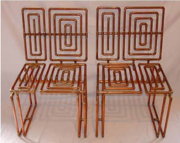 銅管桌子說完了,再說說椅子,看到上圖,各位讀者未免懷疑這板凳的穩定性,如果你親自用手彎一下外徑35mm,壁厚且2mm的銅管,相信你再也不會擔心這板凳的承重能力,銅管可按照自己的想法切割,但是事先得設計好圖紙,用銅管設計最重要的是要考慮連接處的穩定性,以銀焊條焊接可以很好的保證連接處的穩定性,以上的板凳如果讀者對靠背的牢固程度擔憂,可在椅面與椅背之間加一根支撐,利用三角形的穩定性,也可在椅面與椅背之見做一個矩形的扶手,實用也不影響美觀。